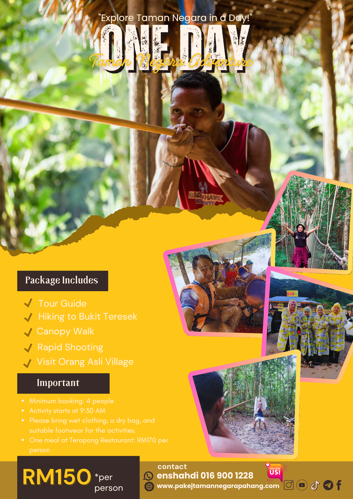 "Are you ready for an unforgettable escape into Malaysia’s ancient rainforest? The One Day Taman Negara Adventure is your perfect chance to experience nature, culture, and adrenaline, all in a single day. Starting at 9:30 AM, this exciting tour from Kuala Lumpur or nearby cities is priced at just RM150 per person, making it an accessible thrill for all. Dive into the wilderness of Taman Negara, Pahang, and create memories that last a lifetime!